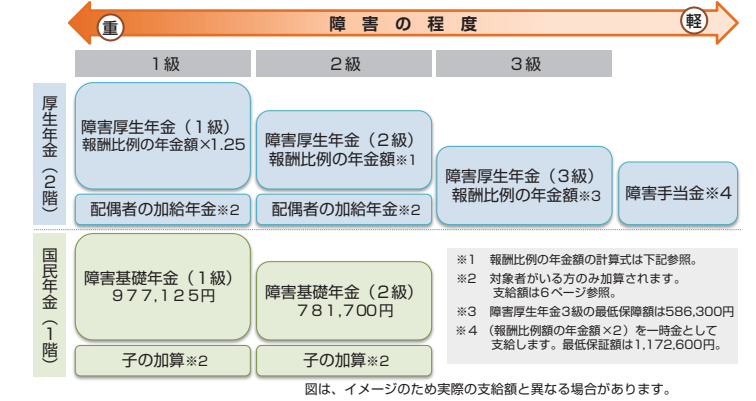 年金額 1級または2級の障がい厚生年金を受けられる時は、障がい基礎年金もあわせて支給されます。3級の障がい厚生年金及び障がい手当金は、厚生年金保険独自の給付です。